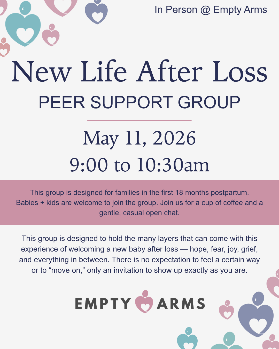 This group is designed to hold the many layers that can come with this experience of welcoming a new baby after loss — hope, fear, joy, grief, and everything in between. There is no expectation to feel a certain way or to “move on,” only an invitation to show up exactly as you are.